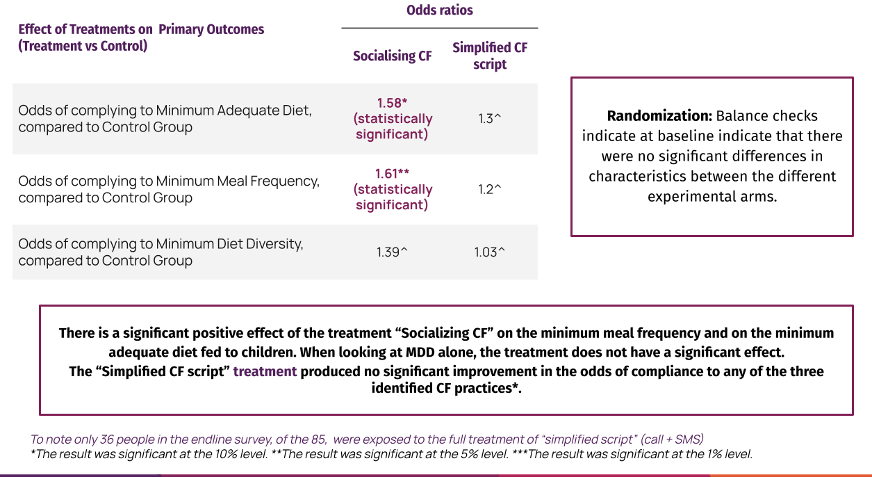 The Simplified CF Script treatment produced no significant improvement in the odds of compliance with MMF, MDD, or MAD. Among secondary outcomes, the Simplified CF Script treatment significantly improved knowledge of food groups and beliefs around complementary feeding. The treatment did not show any significant effects on any other knowledge, attitude, or intention measures.